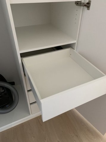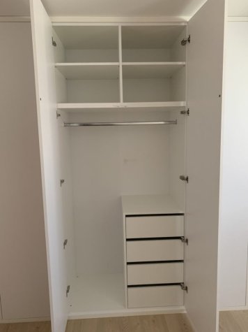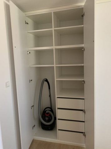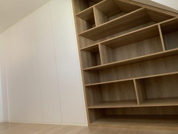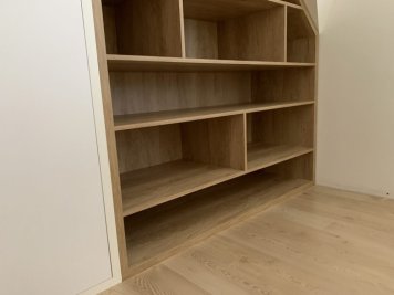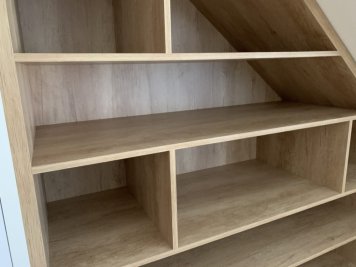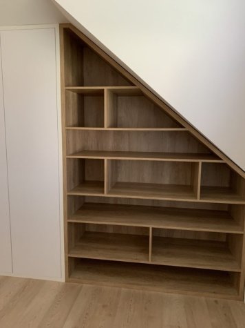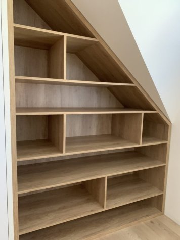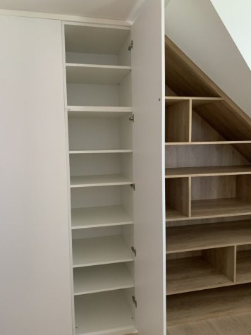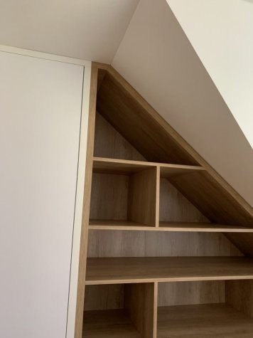 Netradiční atypická vestavěná skříň s knihovnou v šikmině. Kombinace Dubu Nebraska a bílé. Otvírání dvířek je metodou TIP-ON (dotykem). Skříň je prostorově rozdělená na úklidovou část a šatní. V šatní části jsou pak šuplíky pro pohodlný přístup a maximální využití prostoru. Jedná se o šuplíky StrongMax, které se vyznačují úzkými bočnicemi, kuličkovým pojezdem s plným výsuvem a tlumeným dojezdem. Nechybí ani šatní tyč a policová část.