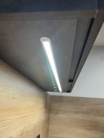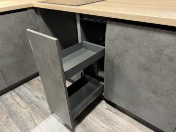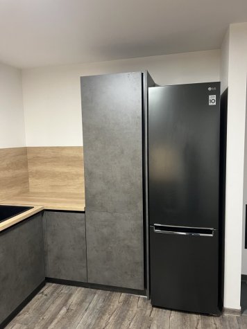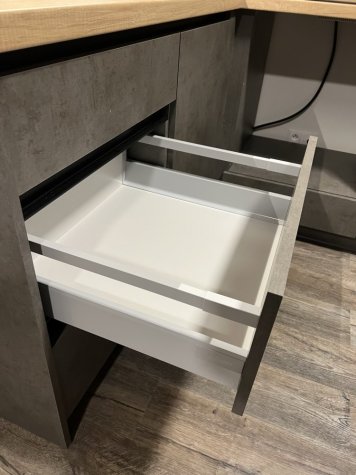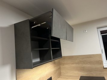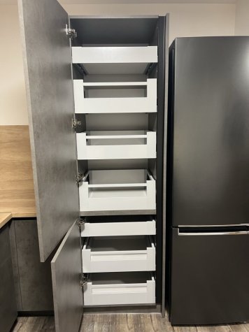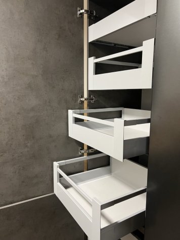 Kuchyň je vybavena bezúchytkovým profilem GOLA v černé barvě. Šuplíky Blum Antaro s tlumeným dojezdem a nosností 35Kg.