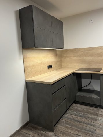 Kuchyně na míru do novostavby rodinného domu v Chuchelné. Odstíny jsou zde v kombinaci Beton Chicago tmavě šedý a Dub Nebraska přírodní.