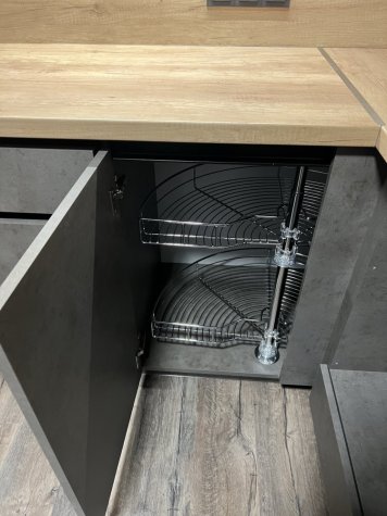 Rohová skříňka je vybavena jednoduchým drátěným karuselem Strong. Horní skříňky jsou osazeny lomeným výklopem Blum.