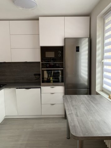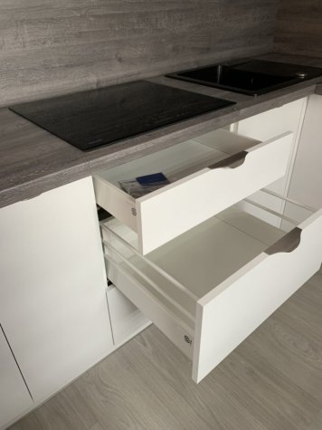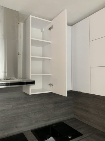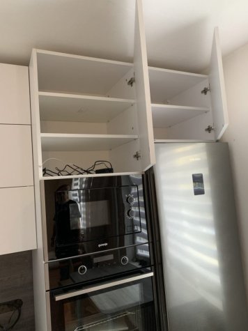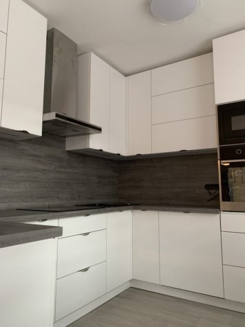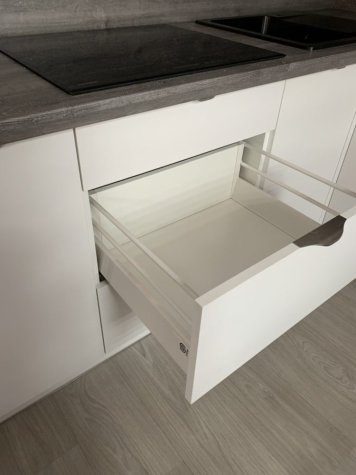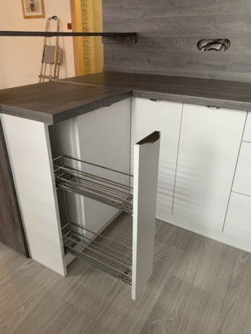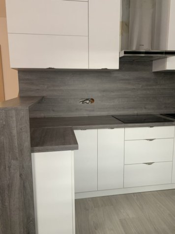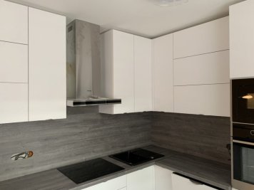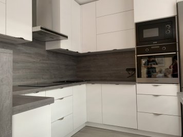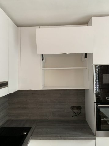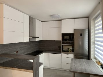Realizace kuchyně na míru v Opavě. Kombinace Alpské bílé a dubu Whiteriver šedohnědého. Horní skříňky jsou v kombinací otvírání klasického do boku a výklopy.