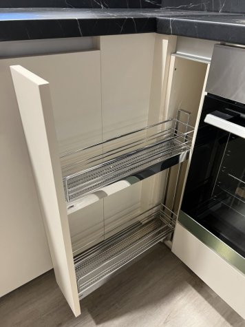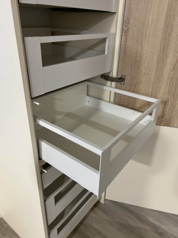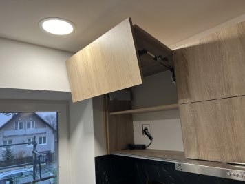 Prostorná kuchyňská linka kombinuje dolní skříňky v krémově béžovém dekoru Egger U222 s horními skříňkami v přírodním dekoru Dub Bardolino H1145 a pracovní deskou v mramorové černé Egger F206 Pietra Grigia. Bezúchytkové otevírání GOLA zajišťuje čisté linie a moderní vzhled, zatímco horní skříňky jsou doplněny lomenými výklopy Blum pro pohodlný přístup. Funkčnost linky podporují šuplíky Blum Merivobox, včetně vnitřních šuplíků v potravinové skříni, rohový karusel Kesseböhmer LeMans II ARENA a praktický výsuv na láhve od stejné značky, které maximalizují úložný prostor a komfort každodenního používání.