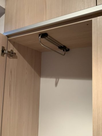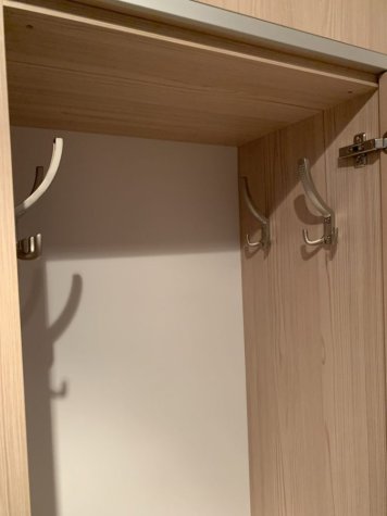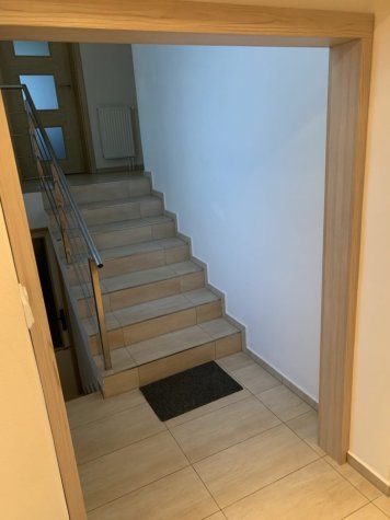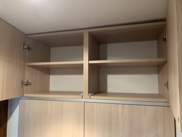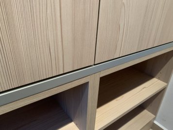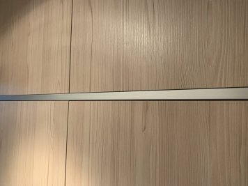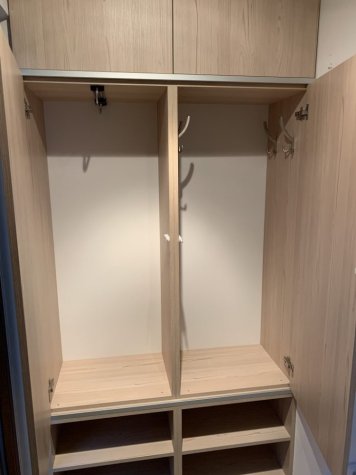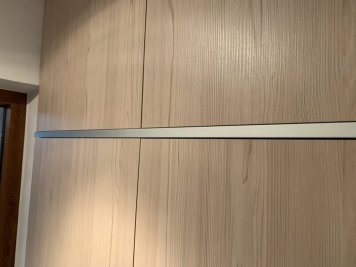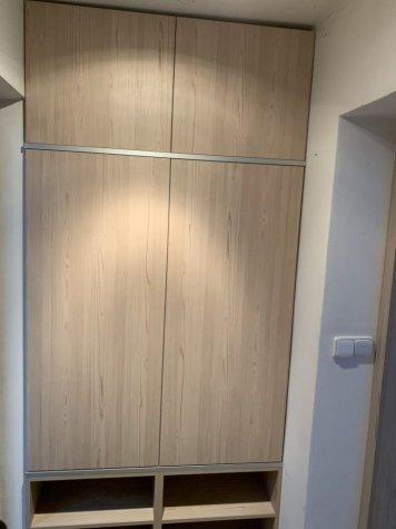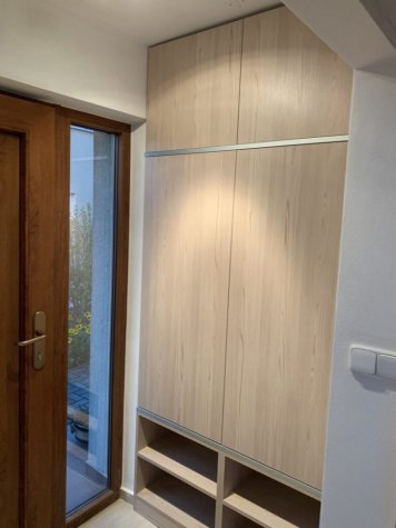 Vestavěná skříň a zárubeň do vstupního prostoru rodinného domu. Skříň je v odstínu Fleetwood šampaňský a je otvíraná dotykem (TIP ON). Mezi jednotlivými patry skříní jsou dělící okrasné prvky z hliníkové lišty. Součástí realizace bylo obložení staré ocelové zárubně do stejného odstínu jako vestavěná skříň.