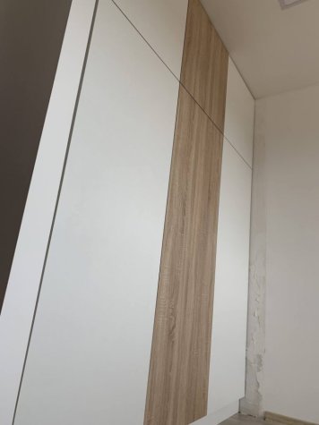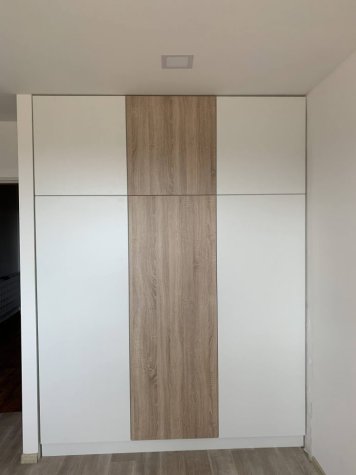 Zakázková výroba vestavěné skříně na míru v odstínech bílé a dubu Bardolino. Dvířka jsou otvíraná systémem TIP ON – dotykem.